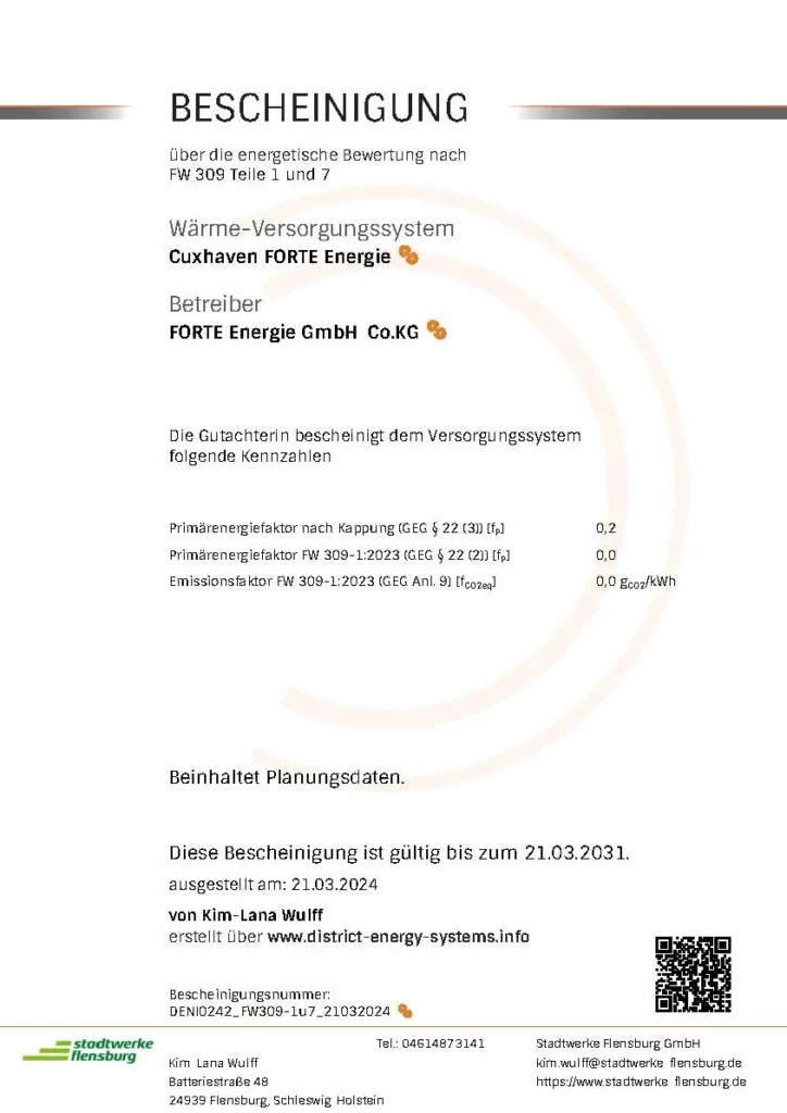 Das Fernwärmenetz der FORTE Energie in Cuxhaven wurde mit einem Primärenergiefaktor von 0,2 zertifiziert.