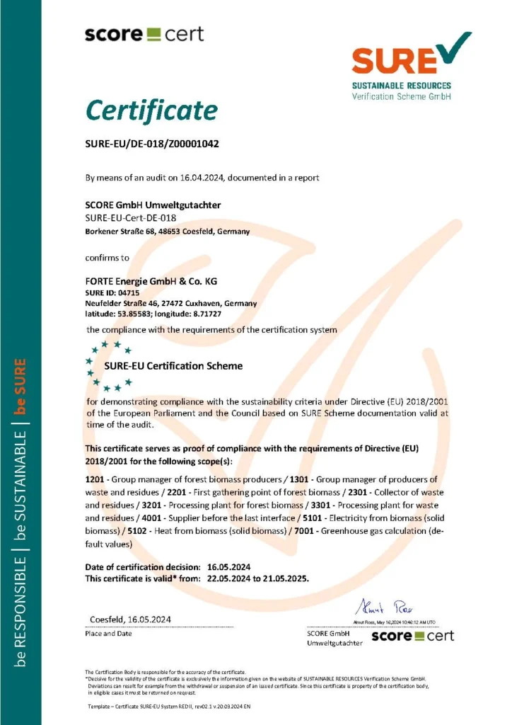 This certificate serves as proof of compliance with the requirements of Directive (EU) 2018/2001 for the following scope(s):
