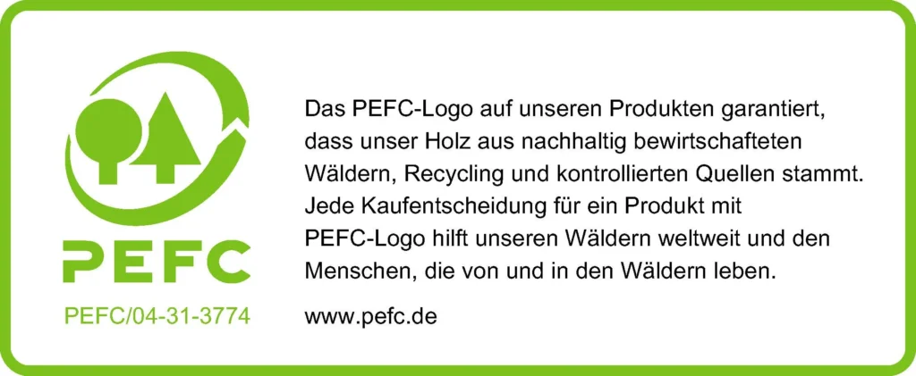 PEFC ist ein transparentes und unabhängiges System zur Sicherstellung einer nachhaltigen Waldbewirtschaftung. Die PEFC-Zertifizierung ist damit eine Art weltweiter „Wald-TÜV“. Holz- und Papierprodukte mit dem PEFC-Siegel stammen aus ökologisch, ökonomisch und sozial nachhaltiger Waldbewirtschaftung.